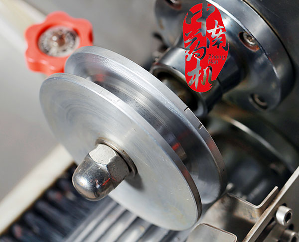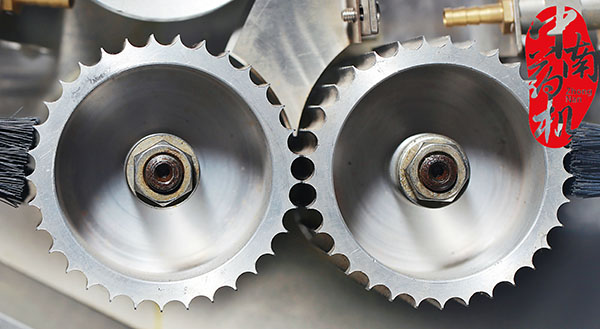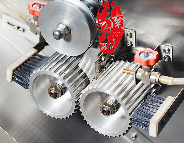 第三、制丸机通过翻版翻转挤压,在推进器的作用下,药条有侧面料嘴挤出,当药条达到一定长度时,自动切刀切段,再由分配器以每秒一次的速度将药条送入搓滚;通过任意调节制条速度和拨条速度控制制药条长短,操作简单方便。